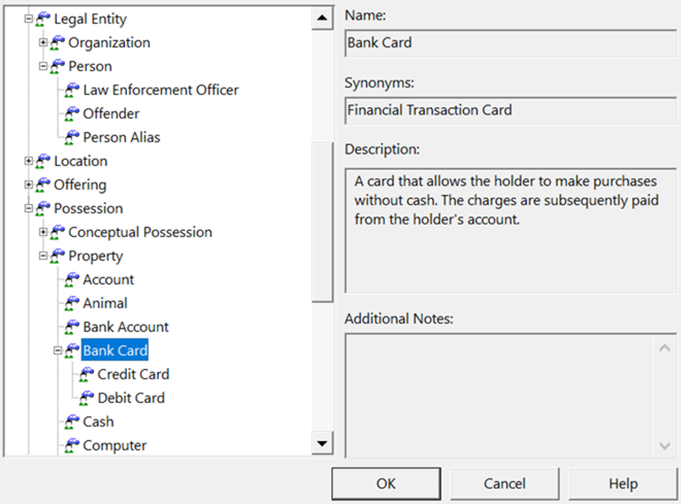Figur 1 viser nogle semantiske typer, og hvordan de er klassificeret i iBase/Analyst's Notebook. For eksempel vil du se, at der under kategorien 'ejendom' er flere underkategorier, herunder 'konto', 'dyr', 'bankkonto' og 'bankkort'. Under underkategorien 'bankkort' er der yderligere to underkategorier, nemlig et 'kreditkort' og et 'debetkort'. Disse underkategorier, der falder sammen under den samme kategori, er horisontalt justeret. De er ikke underordnet hinanden.